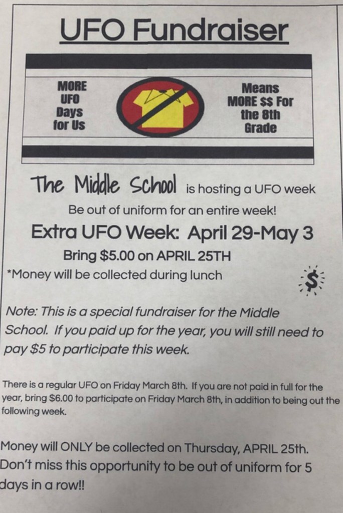 Our Prescott Middle School is hosting an extra Uniform Free Option (UFO) week. Students bring $5 on Thursday, April 25th to participate! Money will be collected at lunch. Or pay online http://UFO.givesmart.com.See flyer for more details!