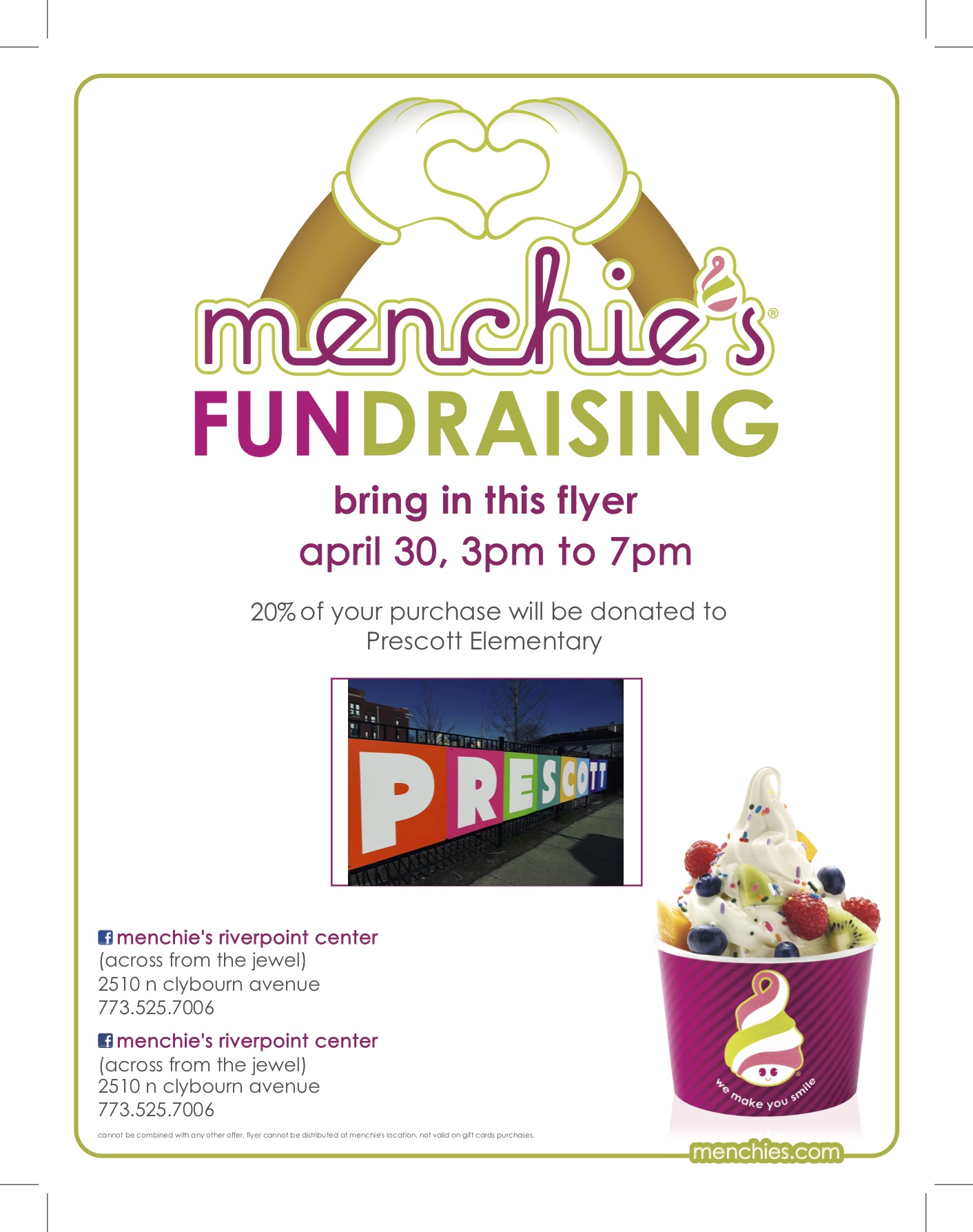 Join us for our next pop-up, ‘dine-in’ fundraiser at Menchie’s! Stop by Menchie’s, 2510 N. Clybourn Avenue—across from Jewel— for a frozen yogurt treat April, 30th from 3:00 p.m.-7:00 p.m. Twenty percent of your purchase will be donated to Prescott.
