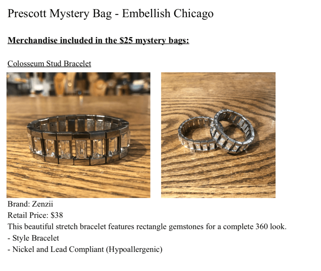 One of the many highlights of this year’s Prescott Benefit is the Gift Garden mystery bag pop-up sponsored by Embellish Boutique owner and Prescott mom Carrie Bowers. Here is just a small sample of the many items available in the mystery bag up for bid at the Gift Garden. Choose from $25 and $50 mystery gift bags.
