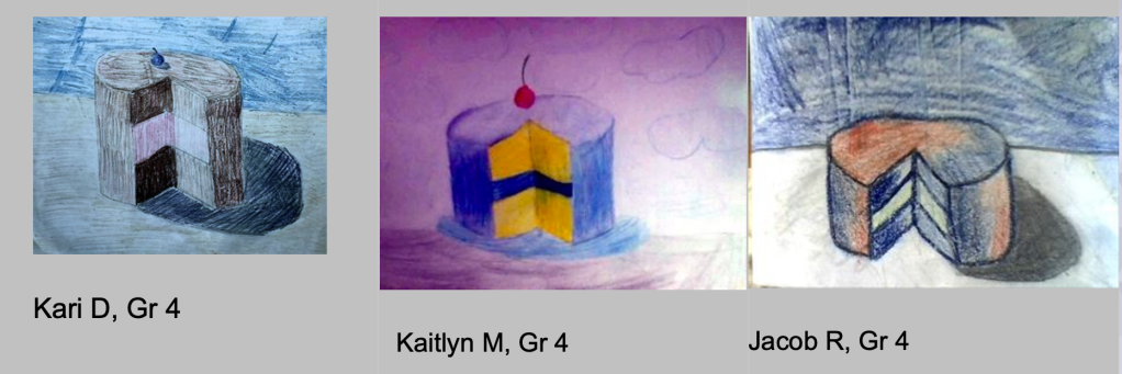The 4th grade artists studied the art of Wayne Thiebaud and looked at how he used any color but black for shadows. Using this new knowledge and building upon their perspective skills, they created these amazing cakes.
