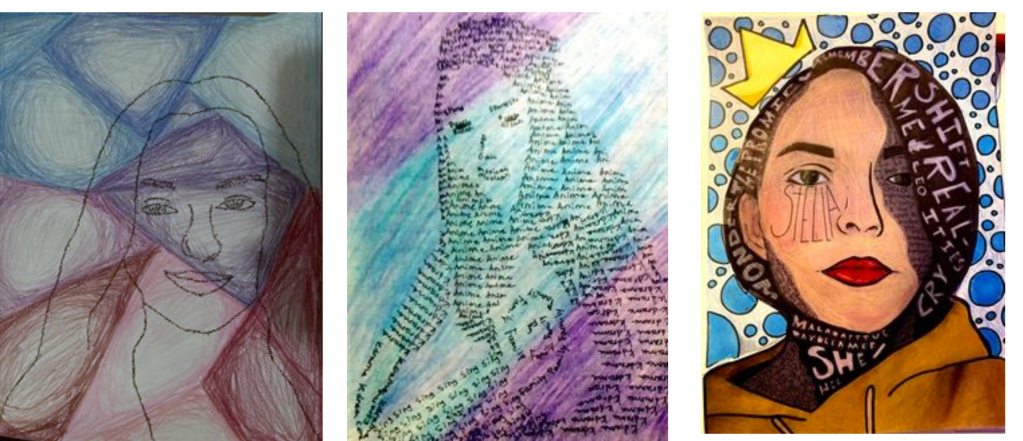 The 8th grade artists explored the ancient art of Micography. See where the words of the subject or the person make up the lines that create their portrait.