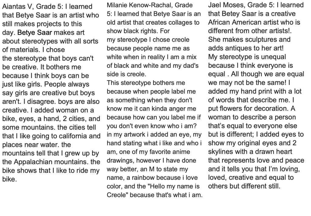 Austin B, Grade 5: I learned that Betye Saar was a black woman who was treated unequally and she grew up fighting sterotypes with art. The art that was made is nothing of the ordinary. She made assembled junk and objects into her art, making statues of something that represents friendship and peace. I chose to fight