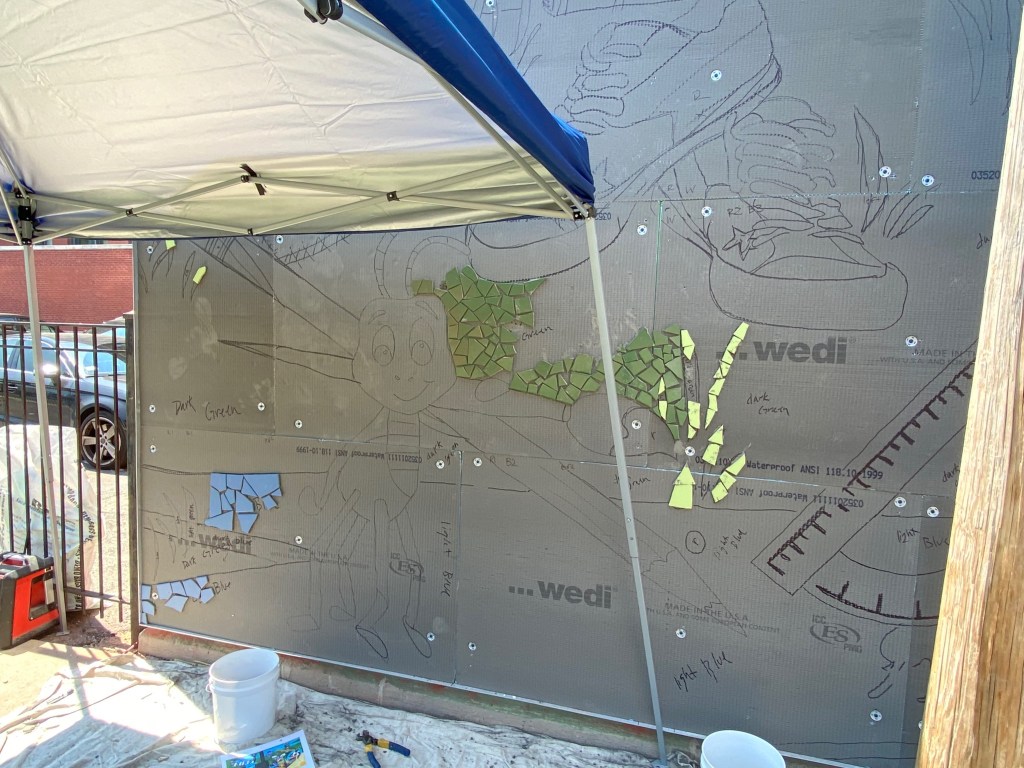 Under the direction of the artist group, Green Star Movement, our 8th graders broke tiles and then filled them in with grout onto 8’x4′ boards. Then Green Star Movement will mount the boards onto the wall. Other students in 7th grade will also likely help the next week. It’s a big project!