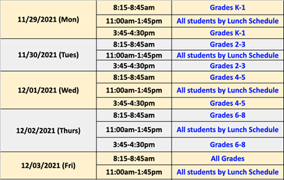 In light of the COVID-19 pandemic, we need to make every effort to create a safe and healthy environment for our school community. To do this, we will limit the number of patrons to 10 students or 10 family groups at a time and encourage patrons to browse and/or purchase books in a timely manner so that others waiting outside can get an opportunity to make purchases. Also, we will follow the schedule below by grade levels to support our social distancing efforts in our very limited space (staff lounge). Please take a look below at the schedule and plan your time to attend the book fair ONLY on the day/times shown. We appreciate your cooperation and understanding to help us safely run the in-person book fair.