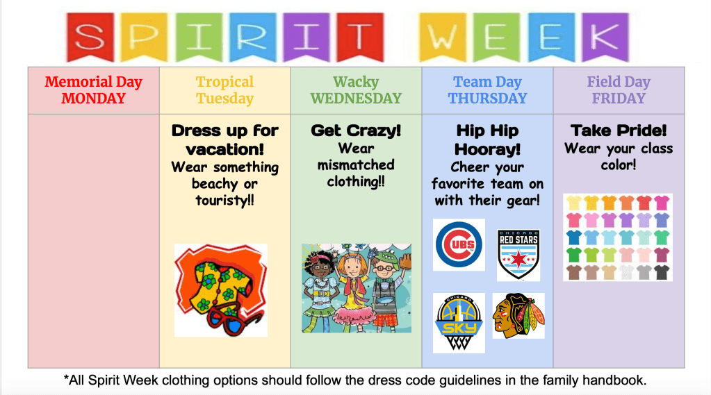 Homeroom teachers will notify their students what their class color is this week. Also, all spirit week clothing should adhere to the dress code guidelines in the Prescott Family Handbook.